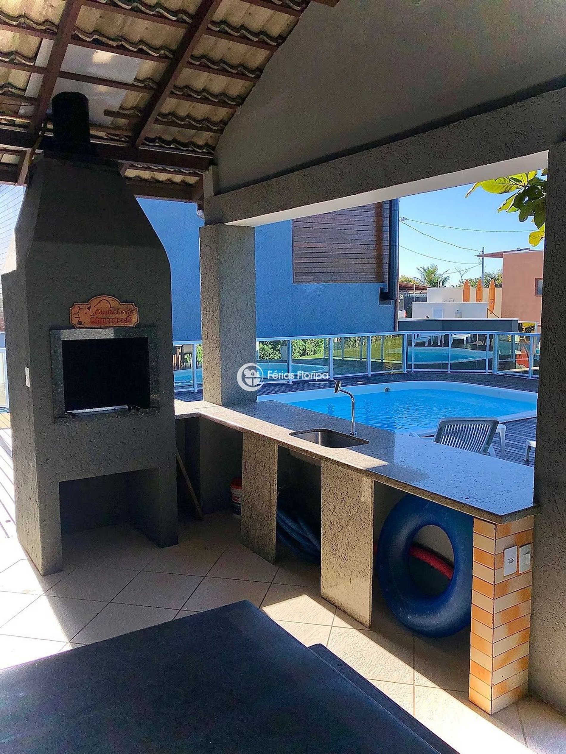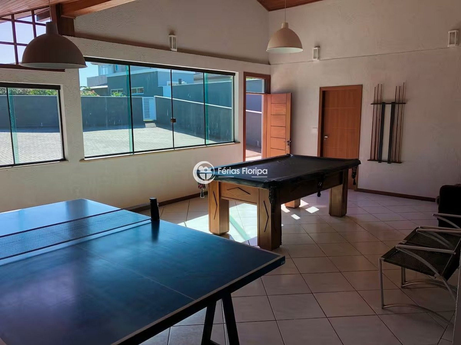 São 3 quartos todos climatizados, 4 banheiros, salas de estar e de jogos, churrasqueiras, cozinha integrada, piscina, jardim e com acesso direto à Praia do Campeche.