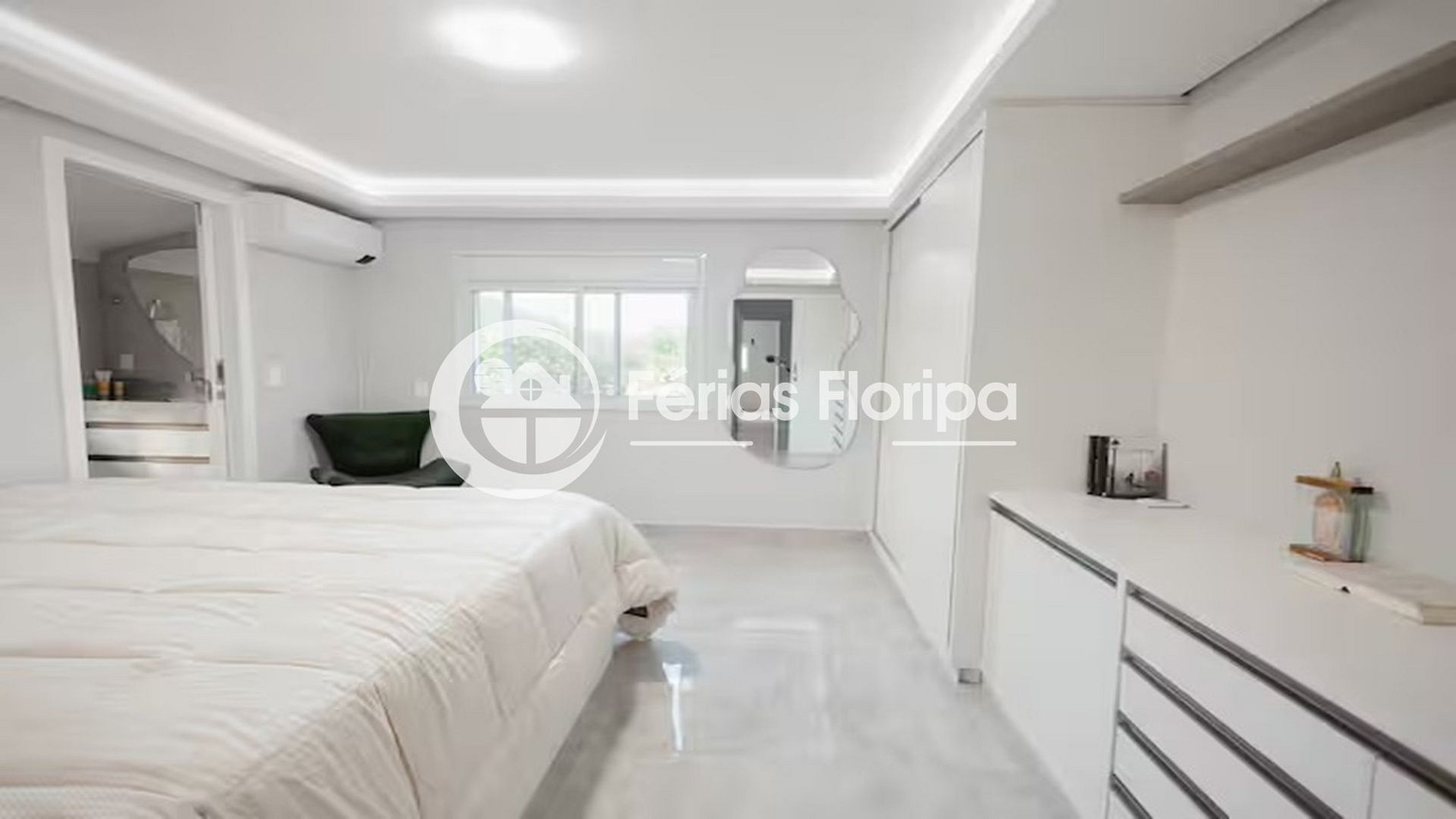 Quarto 1 (suíte): cama de casal, ar-condicionado e amplo espaço