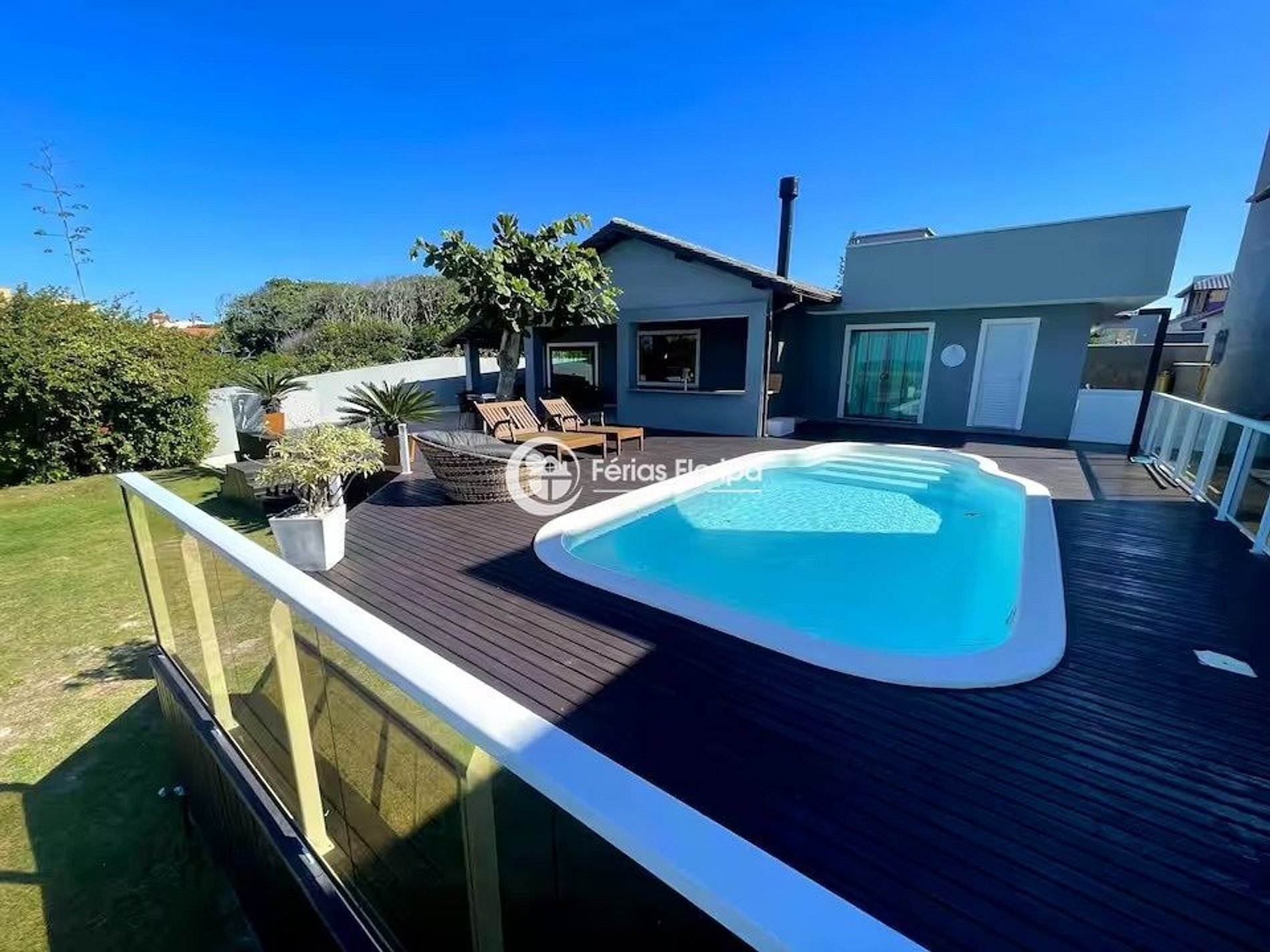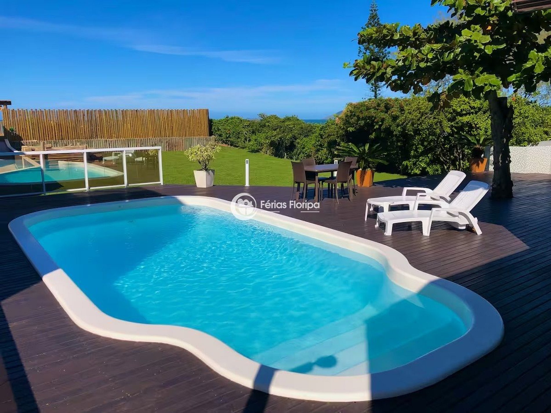 São 3 quartos todos climatizados, 4 banheiros, salas de estar e de jogos, churrasqueiras, cozinha integrada, piscina, jardim e com acesso direto à Praia do Campeche.